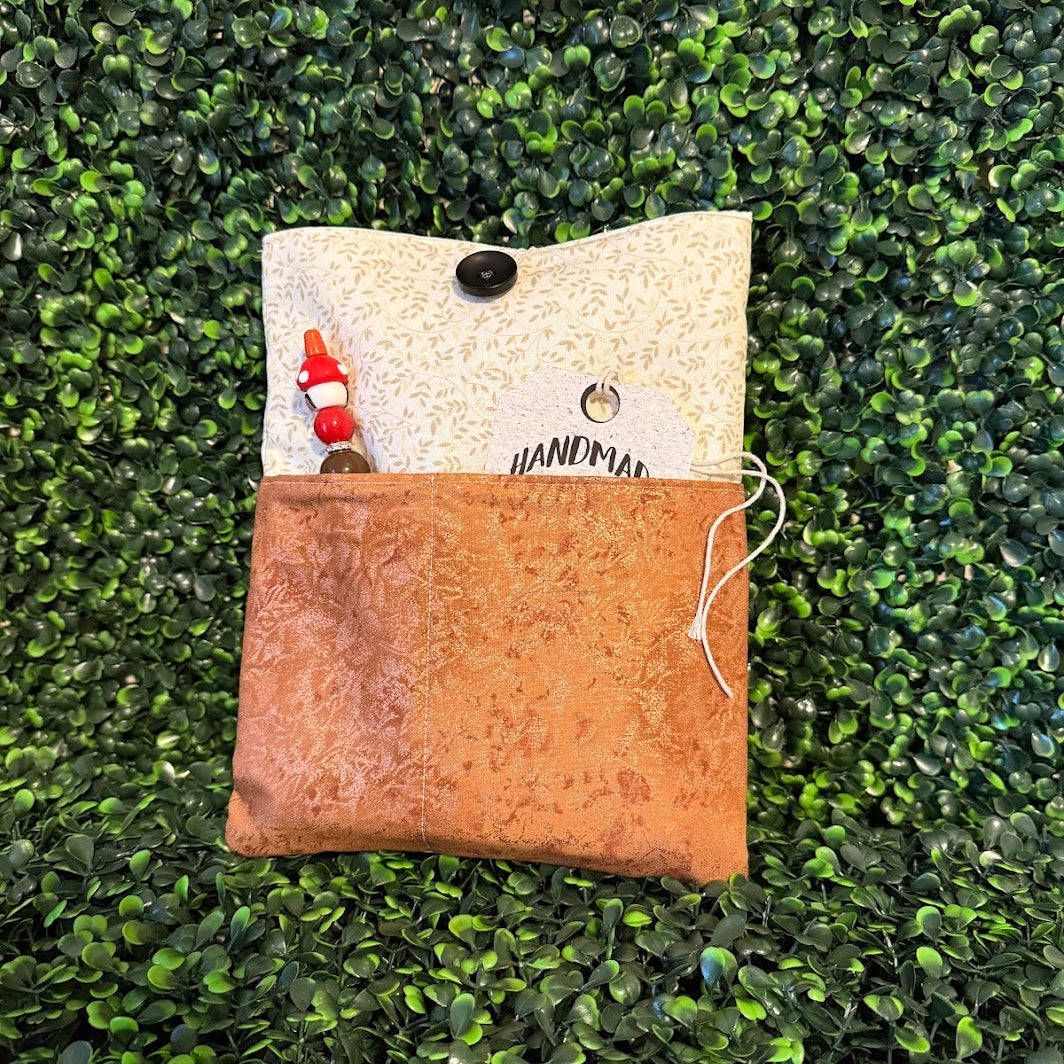 This handmade book sleeve is 8 inches wide, and 10 inches tall.