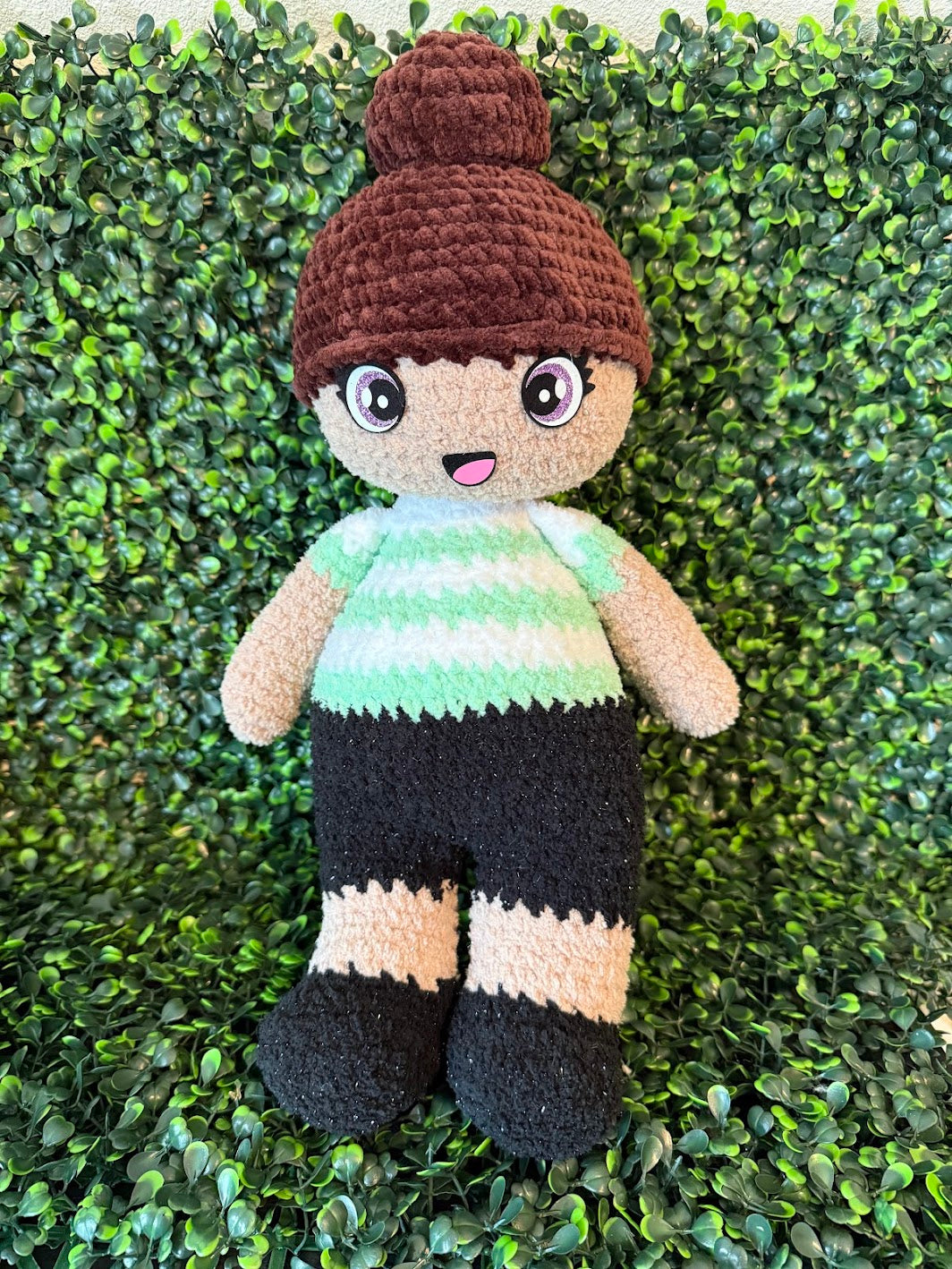 Handmade Crochet Doll Plushie. This doll is made with Premier yarn and is about 16 inches tall from head to feet.