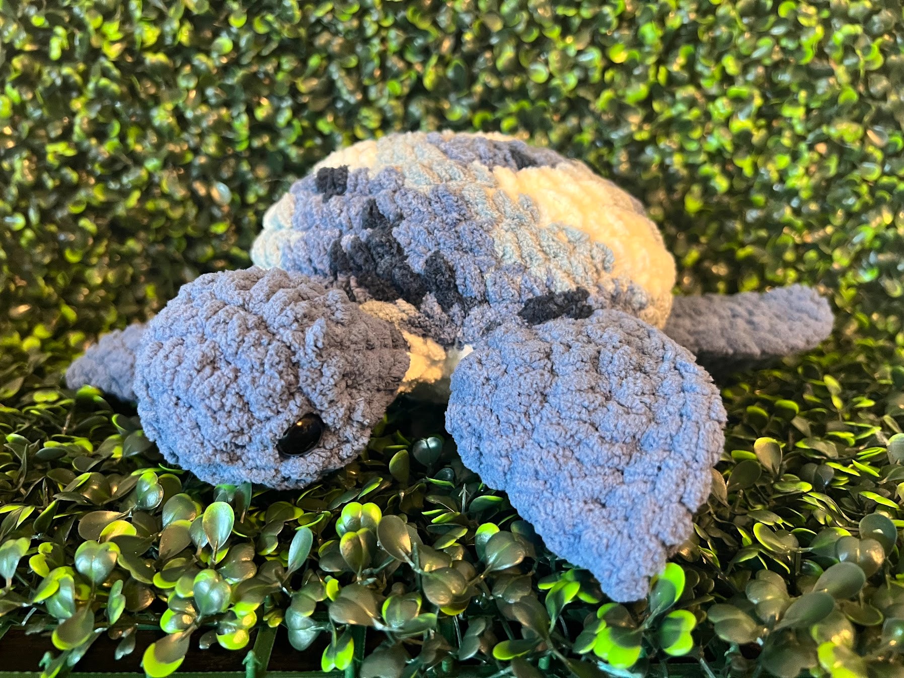 Handmade Crochet Turtle Plushie. This adorable turtle measures 12 inches from head to tail with a shell that is 9 inches long.